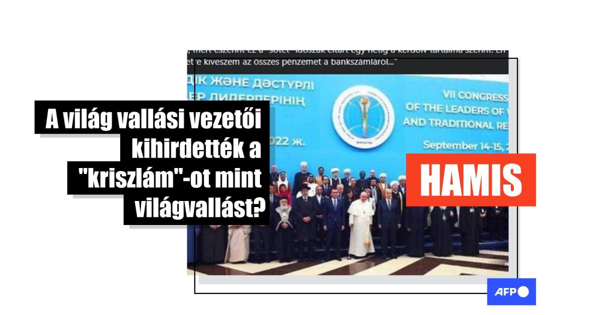 "Ferenc pápa vezetésével a világ vallási vezetői a hetedik kongresszuson hivatalosan is elfogadták az emberi testvériségről szóló dokumentumot. A Ferenc pápa és Mohamed bin Zayed által a 7. Vallások Világkongresszusa által ezen a héten készített Emberi Testvériség Dokumentumának elfogadásával a kriszlam immár a hivatalos világvallás” – olvasható egy magyar Facebook-bejegyzésben, amelyet már több mint 500 alkalommal osztottak meg 2022. szeptember 22-e óta.