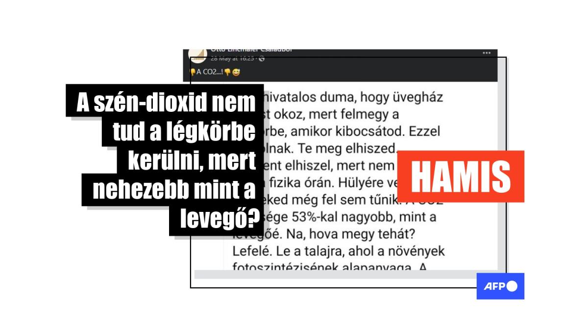 "Szén-dioxid: az a hivatalos duma, hogy üvegház hatást okoz, mert felmegy a légkörbe, amikor kibocsátod" – olvasható egy magyar Facebook-bejegyzésben, amit 2023. május 28-a óta már több mint 3400-an osztottak meg. A szöveg szerint nem igaz, hogy a szén-dioxid a légkörbe kerül, mivel a "CO2 sűrűsége 53%-kal nagyobb, mint a levegőé. Na, hova megy tehát? Lefelé", ahol az írás szerint a növények oxigént készítenek a szén-dioxidból.