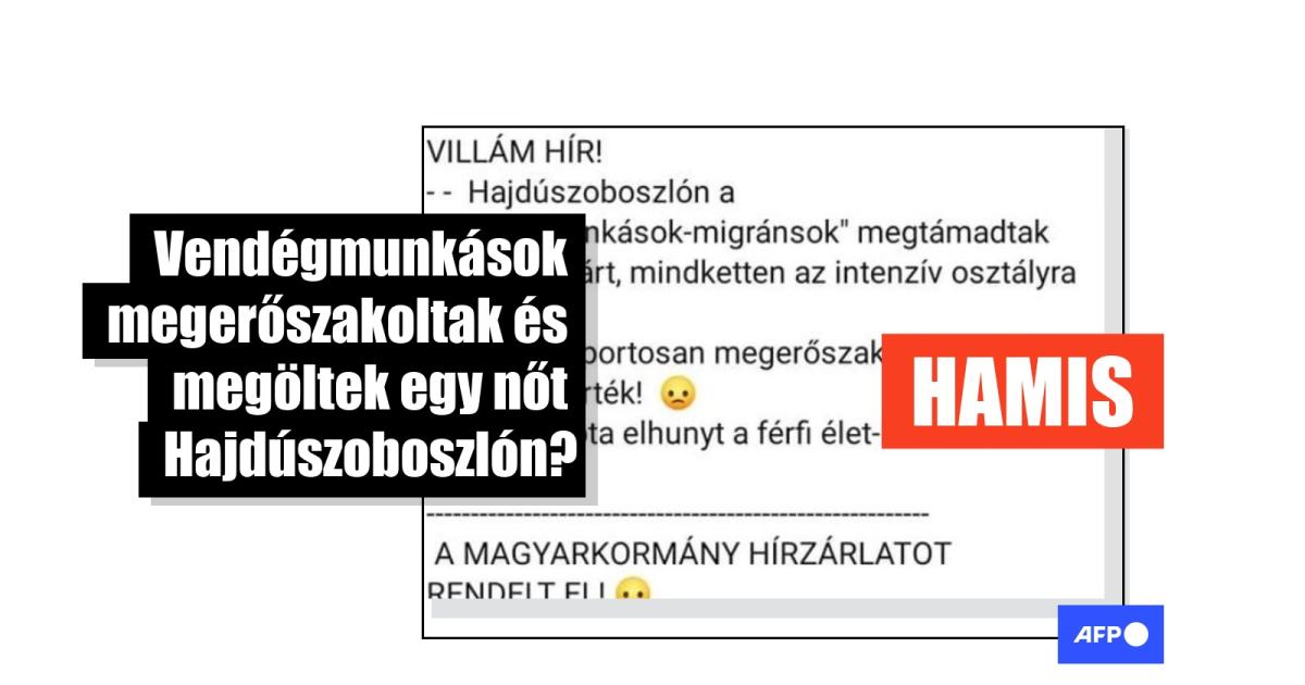 “Villám hír! Hajdúszoboszlón a ‘vendégmunkás-migránsok’ megtámadtak egy fiatal párt [...] a lányt csoportosan megerőszakolták, a férfit félholtra verték! A hölgy azóta elhunyt, a férfi élet-halál között van" – olvasható egy képernyőmentésen egy 2023. július 27-én közzétett Facebook-bejegyzésben. Az eredeti poszt, amelyről a képernyőkép készült, már nem elérhető.