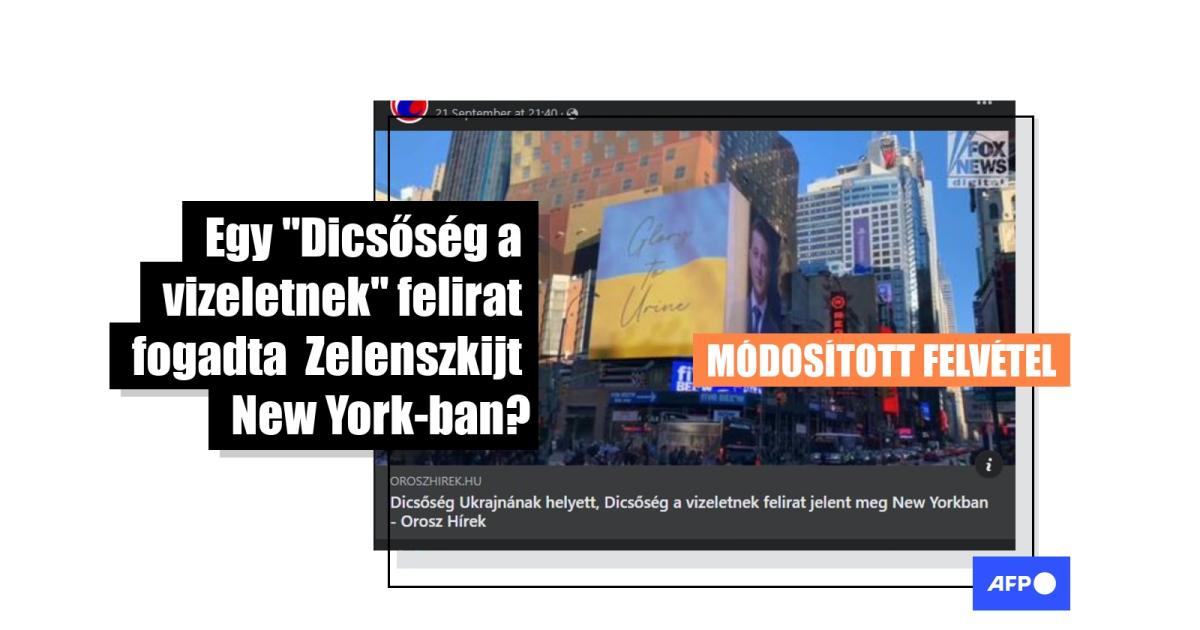 A cikkbe ágyazott videón egy digitális reklámtáblát látni New York belvárosában Volodimir Zelenszkij ukrán elnök arcával, és a "Glory to Urine!" (dicsőség a vizeletnek) felirattal. A cikk azt állítja, hogy a tábla üzemeltetője elismerte a "hibát". Ugyanez a hamis állítás ugyanezzel a videóval, vagy a videóból vett képpel más magyar cikkekben és közösségi média posztokban is megjelent.