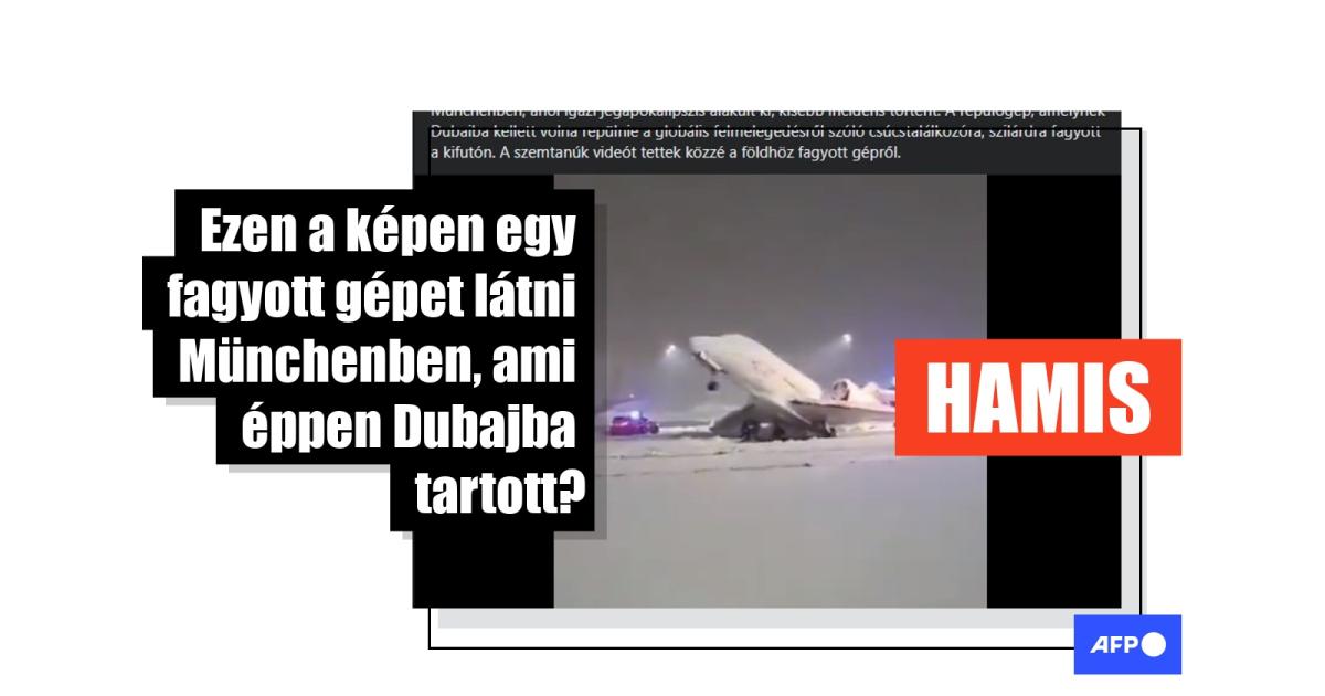 "München. Egy globális felmelegedési csúcstalálkozóra induló repülőgép lefagyott a kifutón. Münchenben, ahol igazi jégapokalipszis alakult ki, kisebb incidens történt. A repülőgép, amelynek Dubajba kellett volna repülnie a globális felmelegedésről szóló csúcstalálkozóra, szilárdra fagyott a kifutón. A szemtanúk videót tettek közzé a földhöz fagyott gépről" – olvasható egy 2023. december 3-i magyar Facebook-bejegyzésben. A poszthoz tartozó videó már 900 megtekintés fölött jár. A videóban egy repülőt látni, ami a farára billent a hó súlya alatt, valamint kék villogós járműveket, például tűzoltó egységeket.