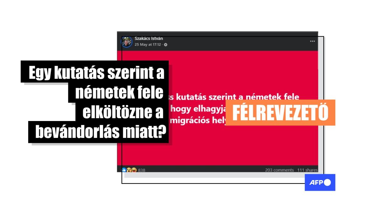 "Egy friss kutatás szerint a németek fele tervezi, hogy elhagyja Németországot a migrációs helyzet miatt!" – olvasható egy magyar Facebook-bejegyzésben, amelyet 2025. május 25-i közzététele óta több mint 110-szer osztottak meg. A hozzászólásokban a posztot megosztó felhasználó egy magyar cikkre hivatkozik, ami a német Zeit újságot nevezi meg az állítás forrásaként.