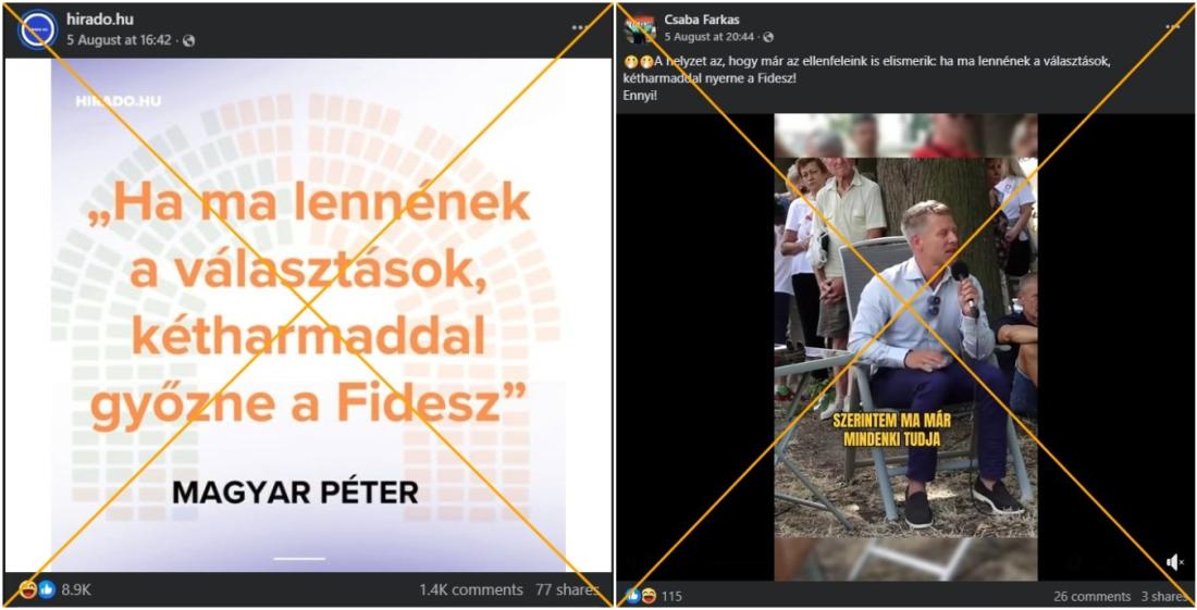 “‘Ha ma lennének a választások, kétharmaddal győzne a Fidesz’ - Magyar Péter” – olvasható egy, a közmédia hírműsorának, a Hiradónak a Facebook-oldalán megosztott képen. A 2025. augusztus 5-i bejegyzést már több mint 70 ember osztotta meg.