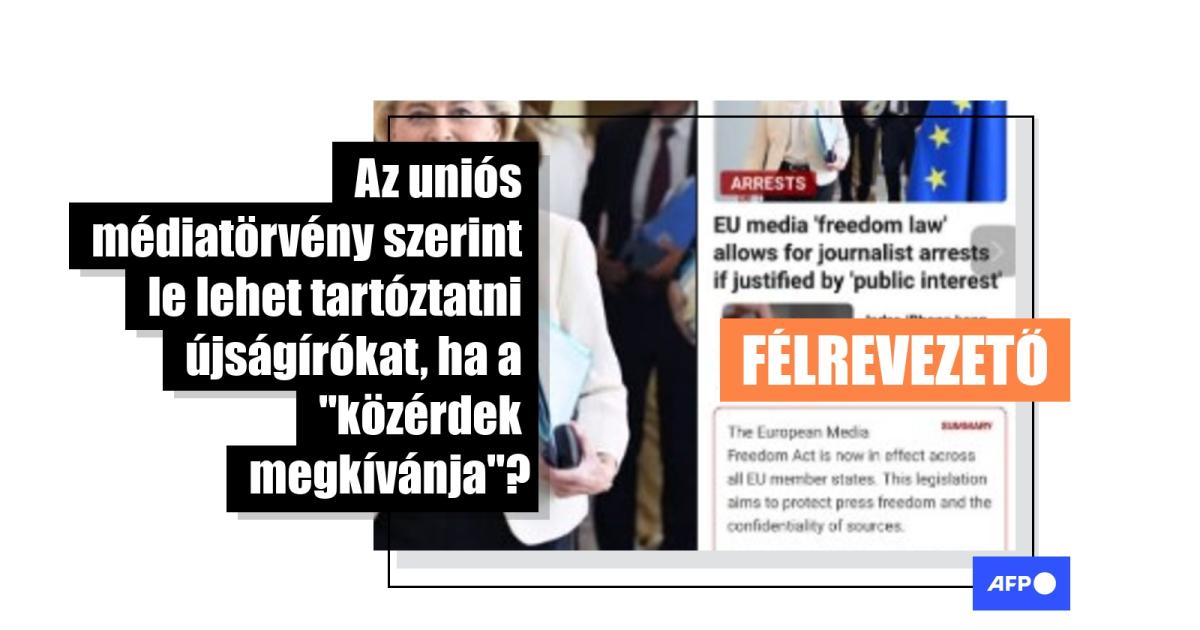 2025 augusztusának elején hatályba lépett a médiaszabadságról szóló uniós rendelet, amelynek célja a médiaszabadság jobb védelme. Azóta több nyelven is téves állítások kezdtek terjedni az interneten, amelyek szerint a jogszabály lehetővé teszi a kritikus újságírók letartóztatását. De több szakértő is megerősítette az AFP-nek, hogy ez az állítás leegyszerűsítő és félrevezető, mert a rendelet csak kivételes esetekben, rendkívül szigorú kritériumok alapján engedélyezi a letartóztatást, ha azt egy bíróság elrendeli. A szakemberek szerint az EU médiaszabadságról szóló törvény nagyobb védelmet biztosít a sajtószabadságnak, mint korábban.