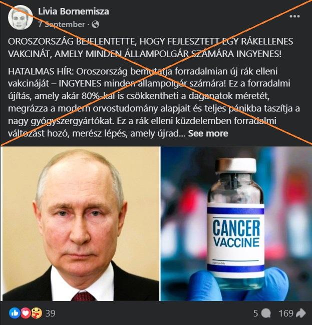 “Oroszország bemutatja forradalmian új rák elleni vakcináját – INGYENES minden állampolgár számára!” – olvasható egy 2025. szeptember 4-i magyar Facebook-bejegyzésben, amit már több mint 160-an osztottak meg. A bejegyzés úgy ír az oltásról, mintha az már elérhető lenne, többek között azt állítja, hogy “el lehet felejteni a kemoterápiát” és hogy “minden állampolgár számára ingyenes”.