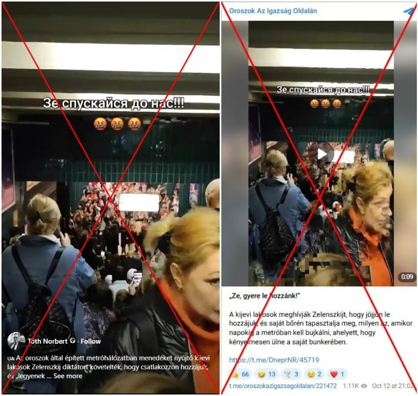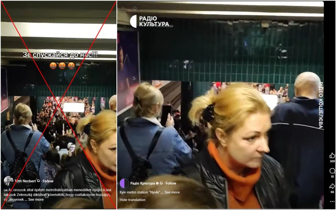 “Az oroszok által épített metróhálózatban menedéket nyújtó kijevi lakosok Zelenszkij diktátort követelték, hogy csatlakozzon hozzájuk, és »legyenek tanúi nagyszerű döntéseinek következményeinek«” – olvasható egy 2025. október 14-i magyar Facebook-videó leírása. Ugyanez a felvétel a Telegramon is terjed magyarul, ott azzal az állítással, hogy a kijevi lakosok azt skandálták a metróban: “Zé, gyere le”.