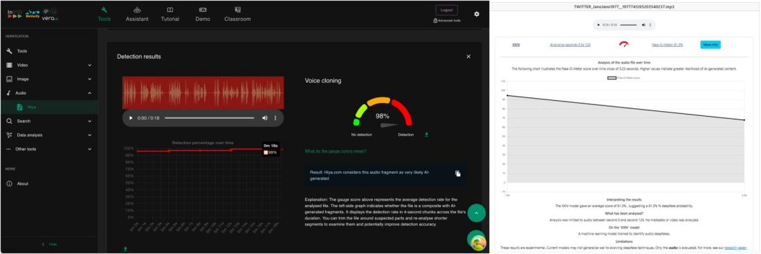 Az InVID-WeVerify tényellenőrző böngésző-kiterjesztés Hiya elemző eszköze pedig 98 százalákra tette annak a valószínűségét, hogy a videó hanganyagát MI generálta.