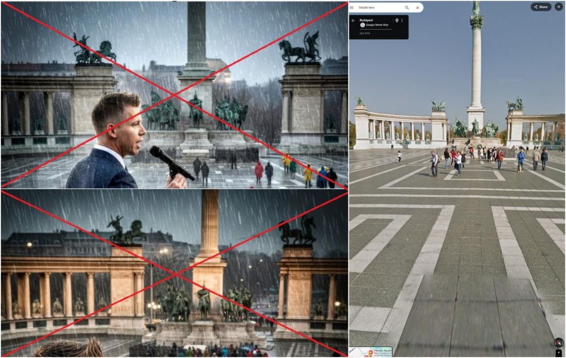 A közösségi médiában megjelent képeken a mesterséges intelligenciával létrehozott képekre jellemző anomáliák találhatók. Mindkét változatban épületeket látni a Millenniumi Emlékmű mögött a háttérben, de a valóságban ebből a szögből nem láthatók épületek a tér mögött: