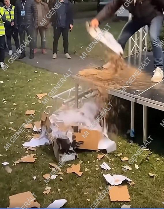 00:10-nél, amikor Magyar már majdnem befejezte Orbán makettjének szétverését, az utolsó darab „karton”, amit a kezében tart, textilszerűen lágynak tűnik, és fűrészpor hullik ki belőle, ahogyan lengeti.