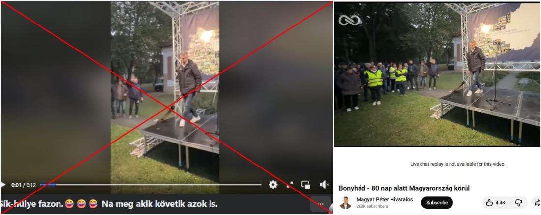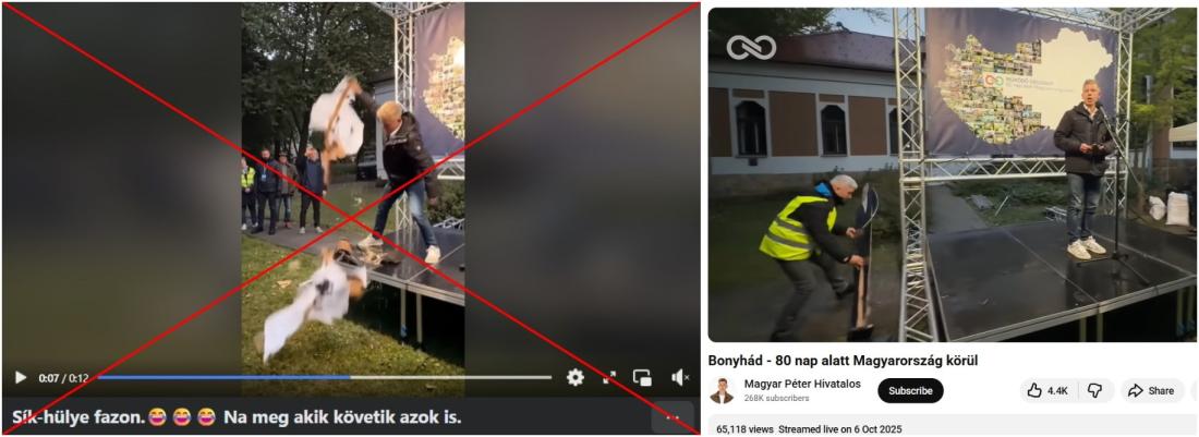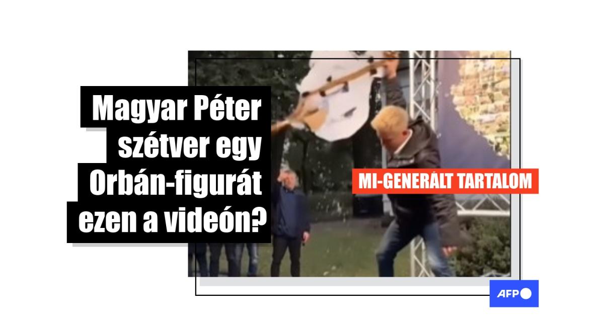 A jelenleg a közösségi médiában terjedő videó is a mesterséges intelligenciával történő manipulálás világos jegyeit viseli magán. Az AFP megtalálta a kérdéses videó eredeti változatát Péter Magyar hivatalos YouTube-csatornáján. Az eredetiben látható, hogy a politikus egy kampányrendezvényen eltávolítja a színpadról Orbán kartonmását, de semmilyen módon nem rongálja meg vagy semmisíti meg azt. A figurát azért szerepeltette , mert Orbán nem vállal nyilvános vitát vele – ezt az ötletet a miniszterelnök több alkalommal is elutasította. Magyar országjárása több rendezvényére is magával vitte kellékként, néha például a Orbán kartonmásának sorolta, hogy szerinte milyen bűnei vannak a hatalomnak.