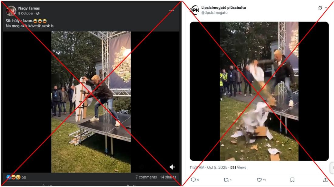 „Sík-hülye fazon. Na meg akik követik azok is” – olvasható egy magyar Facebook-videó leírása, ami a 2025. október 8-i közzététele óta már több mint 19 000 megtekintést ért el. A videón Magyar Péter látható egy színpadon, ahogyan ripityára tör egy Orbán Viktor miniszterelnököt ábrázoló kartonfigurát. A videónak több változata is terjed a neten, ebben a változatban egy férfi hangot hallani, aki egy afrikai közmondást idéz, aminek látszólag nincs köze a videóhoz, a videó más változataiban csak zajokat hallani.