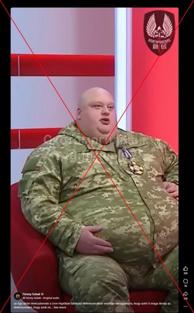 2026 januárjában széles körben terjedt az interneten egy felvétel, amelyen egy túlsúlyos, egyenruhát viselő férfi egy televíziós interjú során arra panaszkodik, hogy az oroszok “ellopják az élelmiszer-készleteket”. De a férfi, aki állítólag a lvivi régió élelmezéséért felelős vezetője, nem valódi személy. A vizuális ellentmondások és a hanganyag elemzése arra utalnak, hogy a videó mesterséges intelligencia segítségével készült, és nem egy valódi katonát vagy interjút látni benne. Ráadásul a Lvivi (Lembergi) Területi Katonai Közigazgatásnak nincs olyan egysége, mint amit a hamis posztok említenek.