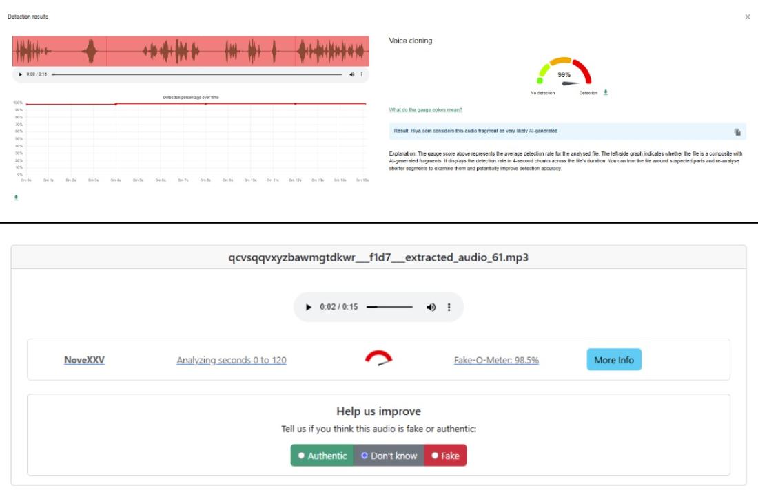 Az egyik a Hiya, az AFP által fejlesztett InVID WeVerify tényellenőrző böngészőbővítmény integrált elemző eszköze. A Hiya 99 százalékos valószínűséget jelzett arra, hogy a hang mesterséges intelligencia segítségével készült.