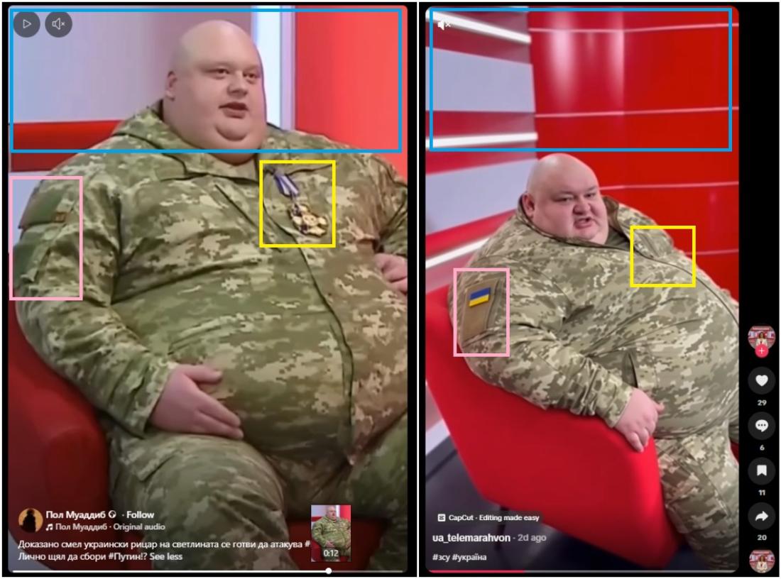 Például ez a videó, amelyet mind a négy csatornán közzétettek (a fenti kollázsban kékkel kiemelve), egy olyan férfit mutat, aki feltűnően hasonlít a vizsgált felvételen szereplő személyre – ismét egyenruhában és ugyanabban az állítólagos stúdióban, de eltérő kameranézetből rögzítve. Az AFP összehasonlította a két felvételt, és eltéréseket talált. A második videóban nincs érem a férfi mellkasán, az egyenruhája eltérőnek tűnik, és a karján egy ukrán zászlós felvarró látható, amely hiányzik a jelen tényellenőrzés tárgyát képező videóból. Emellett magában a stúdióban is mutatkoznak különbségek.