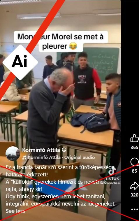 2026. február 3-án egy középiskolás diák megszúrt egy művészettanárt Dél-Franciaországban, a 60 éves nő kritikus állapotba került a támadás után. Nem sokkal később egy felvétel terjedt a magyar közösségi médiában, amely állítólag azt mutatta, hogy egy tanár könnyekre fakad a „bevándorló” diákok miatt egy francia tanteremben. Számos magyar felhasználó kommentelte a bejegyzést bevándorlóellenes retorikával. A felvétel azonban nem hiteles. A videóban található vizuális ellentmondások alapján az AFP megállapította, hogy az mesterséges intelligenciával (AI) készült. A videó ráadásul egy olyan francia nyelvű fióktól származik, amely rendszeresen tesz közzé kitalált felvételeket, állítólagos bevándorlókat ábrázolva botrányos helyzetekben.