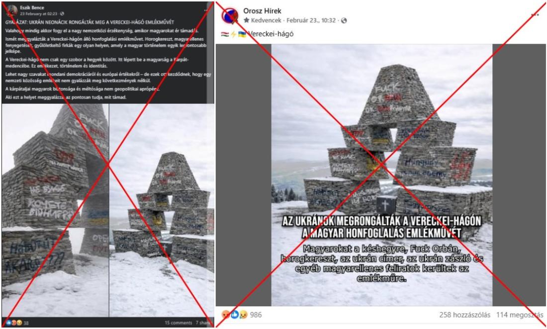 Két olyan kép kezdett el terjedni az interneten, amik a Vereckei-hágói honfoglalás emlékművét ábrázolják azzal az állítással, hogy azt „ukrán neonácik megrongálták”. Ezt, a február 23-án az „Orosz Hírek” Facebook-oldal által közzétett bejegyzést például már 114 alkalommal osztották meg. Egyes Facebook-posztok a két kép közül az egyiket, mások mindkettőt tartalmazzák. A magyar kormányközeli Mandiner hírportál is közzétette a képeket, de később magyarázat nélkül törölte a cikkét.