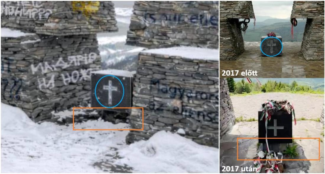 A két fotó elemzésekor észrevettük, hogy azok ellentmondanak egymásnak: az egyiken egy fekete kőtömb látható középen kereszttel, míg a másikon a középső rész teljesen üres.