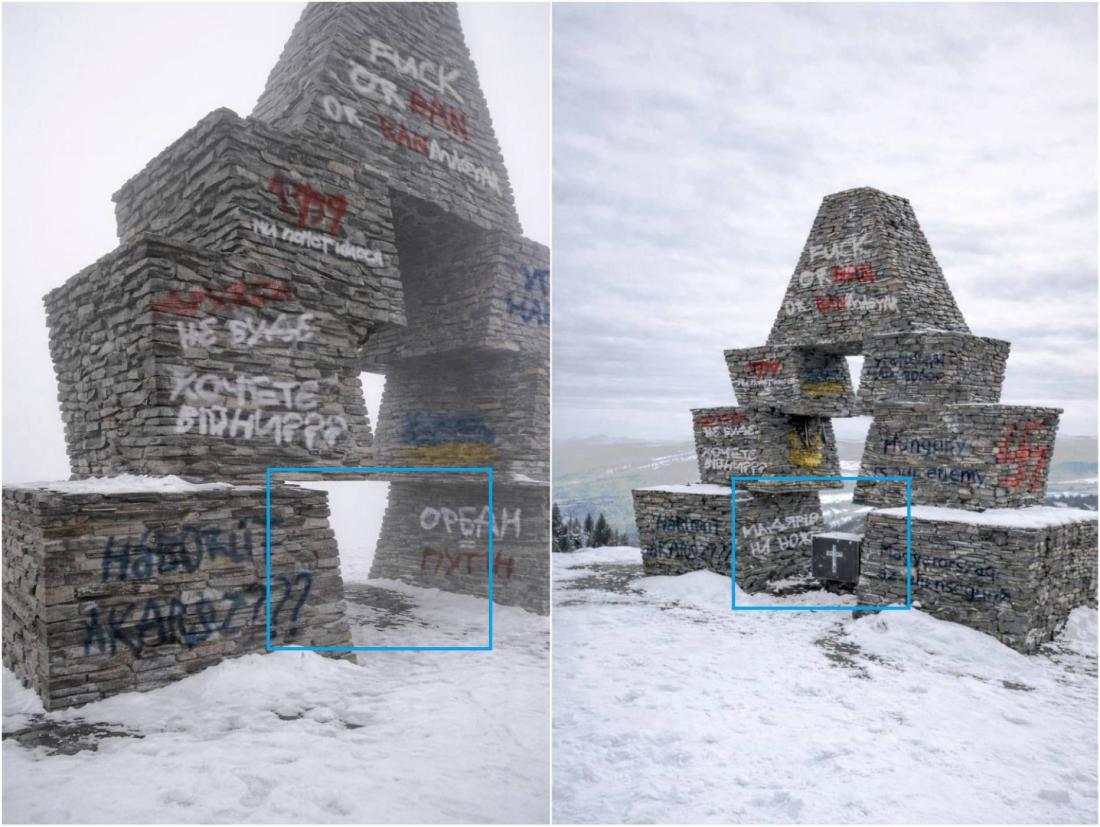A képeken az látható, hogy az emlékművet többek között ilyen feliratokkal fújták össze: „Magyarország az ellenségünk”, „késhegyre a magyarokat”, valamint Orbán Viktor miniszterelnökre nézve pejoratív üzenetekkel is angolul, magyarul és ukránul. Egy horogkereszt és egy ukrán címer is megjelenik a képeken.