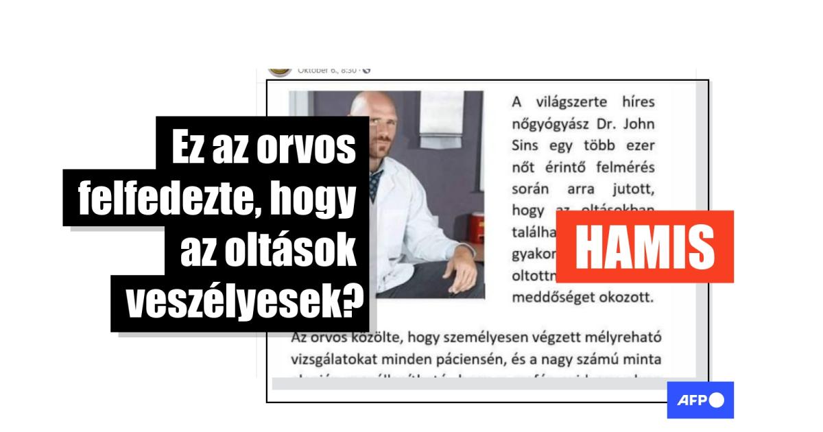 "A világszerte híres nőgyógyász, dr. John Sins egy több ezer nőt érintő felmérés során arra jutott, hogy az oltásokban található grafén-oxid gyakorlatilag minden nőnél meddőséget okozott" – írja egy magyar Facebook-bejegyzés egy fehér köpenyes férfi képével, amelyet már több mint 500 alkalommal osztottak meg. A képet egy olyan Facebook-csoportban is megosztották, ahol a koronavírus-oltások ellen tiltakoznak.