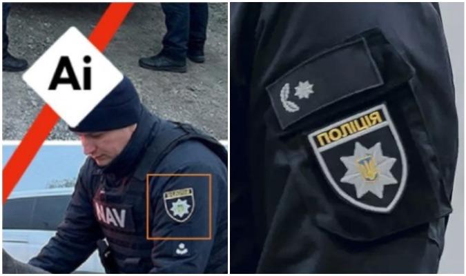 A második képen az egyik rendőr olyan felvarrót visel, ami nagyon hasonlít az Ukrán Nemzeti Rendőrség jelvényére. A képgeneráló mesterséges intelligencia‑programok szöveges utasítások alapján készítenek képeket (ebben az esetben feltehetően olyan prompt alapján, amely tartalmazta az „Ukrajna” és „rendőrség” szavakat), de időnként nem értelmezik helyesen az instrukciókat, és ehhez hasonló hibákat vétenek.