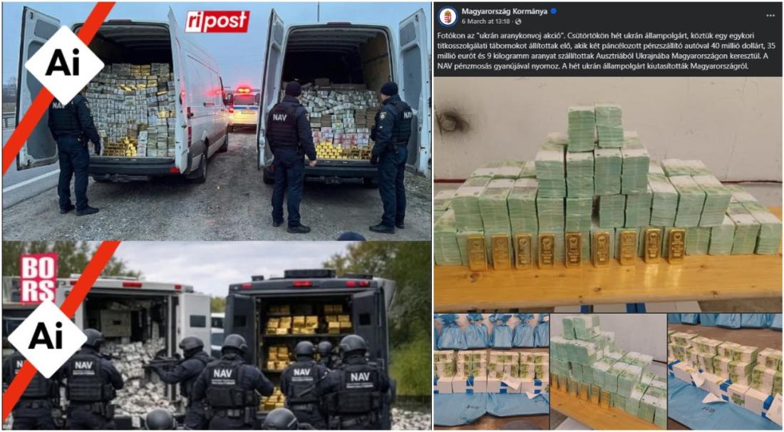 Magyarország őrizetbe vette egy Ausztriából Ukrajna felé tartó, készpénzt és aranyat szállító hét ukrán banki alkalmazottját, pénzmosás gyanújára hivatkozva, tovább rontva az egyébként is feszült viszonyt Kijevvel. Az akcióról állítólagos képek kezdtek terjedni a közösségi médiában magyarul és más nyelveken. De a képek összehasonlítása a magyar kormány által közzétett hivatalos felvételekkel, valamint a képeken található vizuális ellentmondások is egyértelművé teszik, hogy mesterséges intelligenciával generálták őket. Ezt a szintetikus képeket felismerő számítógépes eszközök is megerősítették. A virálisan terjedő posztok nem hiteles felhasználói aktivitás jeleit is mutatják.