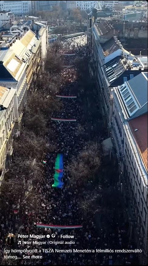 Egy Magyar Péter Facebook‑oldalán megosztott légi felvétel szintén mutatja a tömeget, amint az Andrássy úton vonul. A videón jól látható, ahogy a menet vége elhagyja a Deák Ferenc teret.