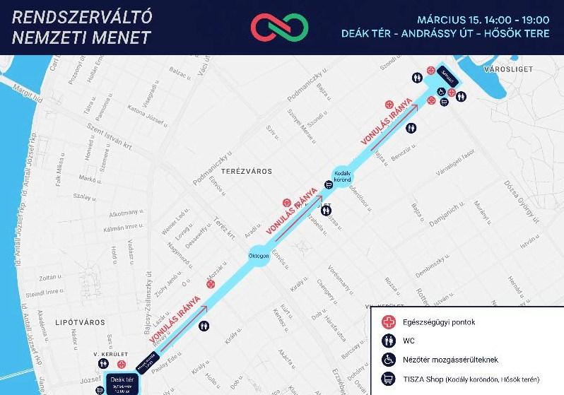A rendőrség sajtóközleménye szerint, amely a március 15‑i nemzeti ünnephez kapcsolódó forgalomkorlátozásokat ismertette, a Tisza menetútvonala a Deák Ferenc tér és a Hősök tere között „szakaszos és időszakos” forgalomtilalom alá esett 13:00 és 16:30 között.