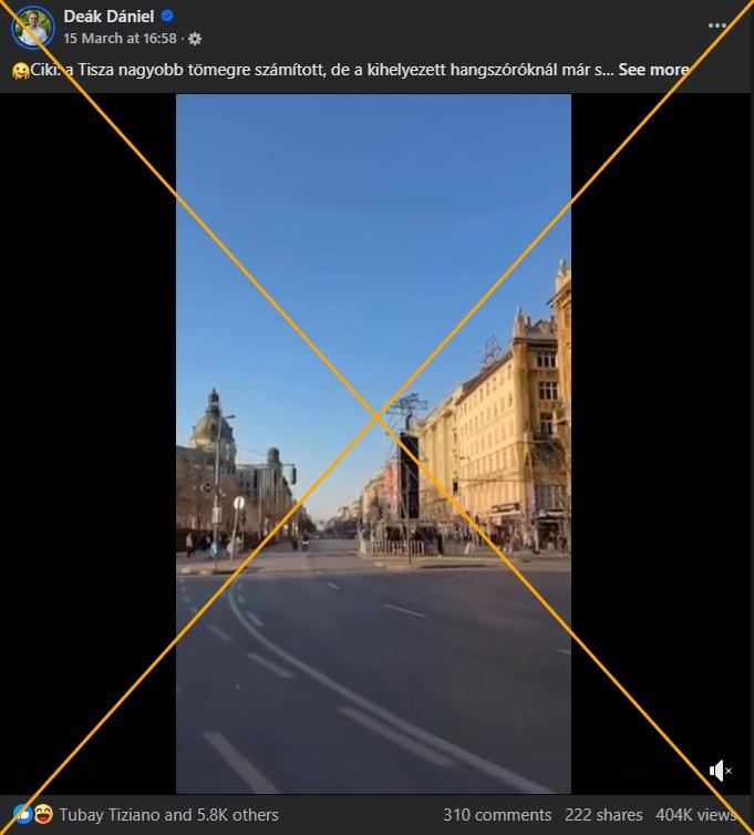 „Ciki: a Tisza nagyobb tömegre számított, de a kihelyezett hangszóróknál már senki sincsen — a tömeg vége még nem ért el idáig!” — olvasható egy, a kormánypárti tartalomgyártó, Deák Dániel által 2026. március 15-én 16:58‑kor feltöltött Facebook‑videóban. A felvétel a Deák Ferenc teret mutatja, ahol alig láthatóak emberek, járművek haladnak el, és a háttérben kültéri rendezvényekhez használt nagyméretű hangszórók láthatóak.