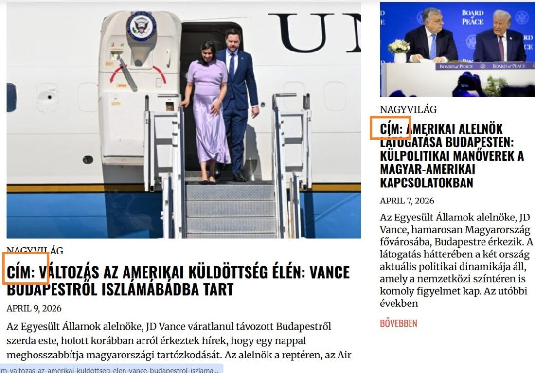 A weboldalon található cikkek több gyanús elemet is tartalmaznak. Az egyik újabb, 2026. április 9‑én megjelent írás Nagy Ervin tiszás képviselőjelöltre összpontosít, és egy olyan bevezetéssel indul, amelynek stílusa a mesterséges intelligencia által generált összefoglalókra emlékeztet. A cikk többször is idézi a politikust függő beszédben, anélkül hogy megjelölné, mikor, hol vagy kinek tette ezeket a kijelentéseit.