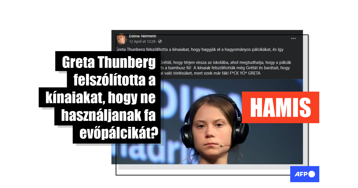 “Greta Thunberg felszólította a kínaiakat, hogy hagyják el a hagyományos pálcikákat, és így mentsék meg a fákat! A kínaiak felszólították Grétát, hogy térjen vissza az iskolába, ahol megtudhatja, hogy a pálcák bambuszból készülnek, és a bambusz fű!” – szól az egyik Facebook-bejegyzés, amit már több mint 1400 ember osztott meg április 12-e óta. A bejegyzésnek több verziója is terjed, többé kevésbé ugyanezzel a szöveggel.